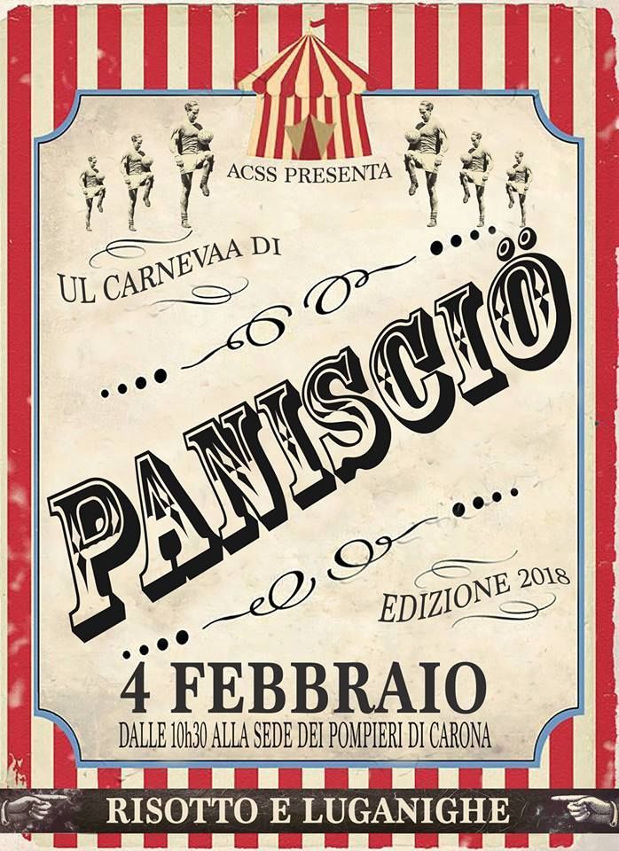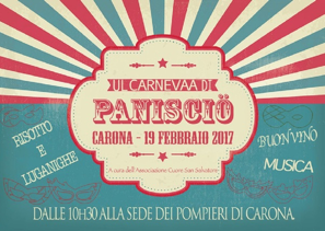 Poco prima del Carnevale abbiamo trovato un'intervista/documentario del 1965/69 al Signor Vitali, in cui si faceva riferimento al nome “di quelli di Carona” come per esempio i “Cavri da Vic” i “Purscei da Meli”, e chi da Carona come i sa ciama? “i Panisciöö” e questo sarà il nome del nostro Carnevale.